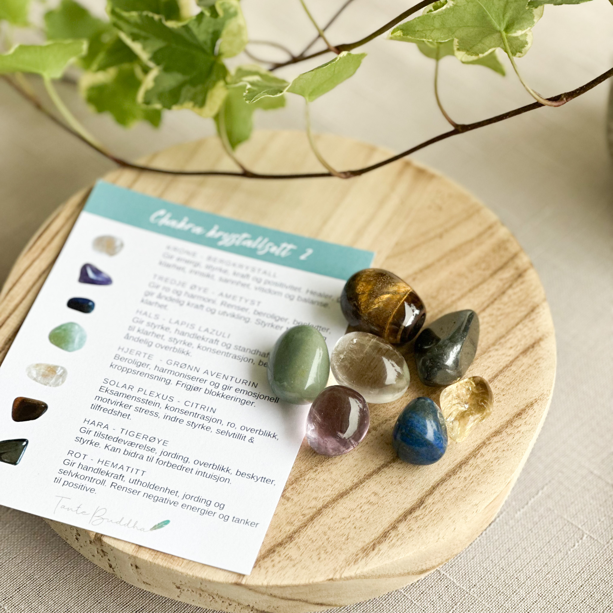 Et chakra krystallsett som består av 7 stener med tilhørighet til hvert av våre 7 chakra. I dette chakrasettet får du bergkrystall, ametyst, lapis lazuli, grønn aventurin, citrin, tigerøye og hematitt.
