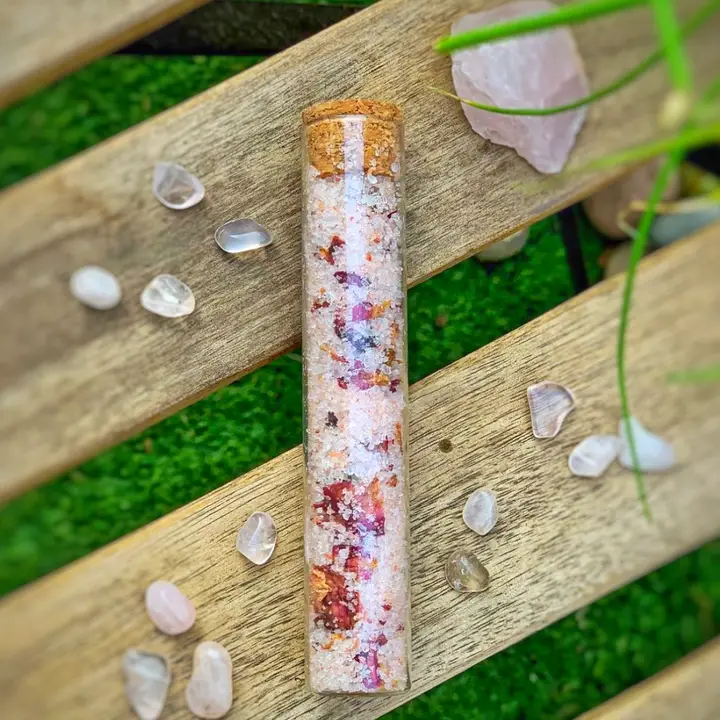 ✨ Innhold: Himalayasalt – Epsom-salt – Lavendelblomster – Kornblomst – Lavendelolje – Roseolje – Krystallkvarts