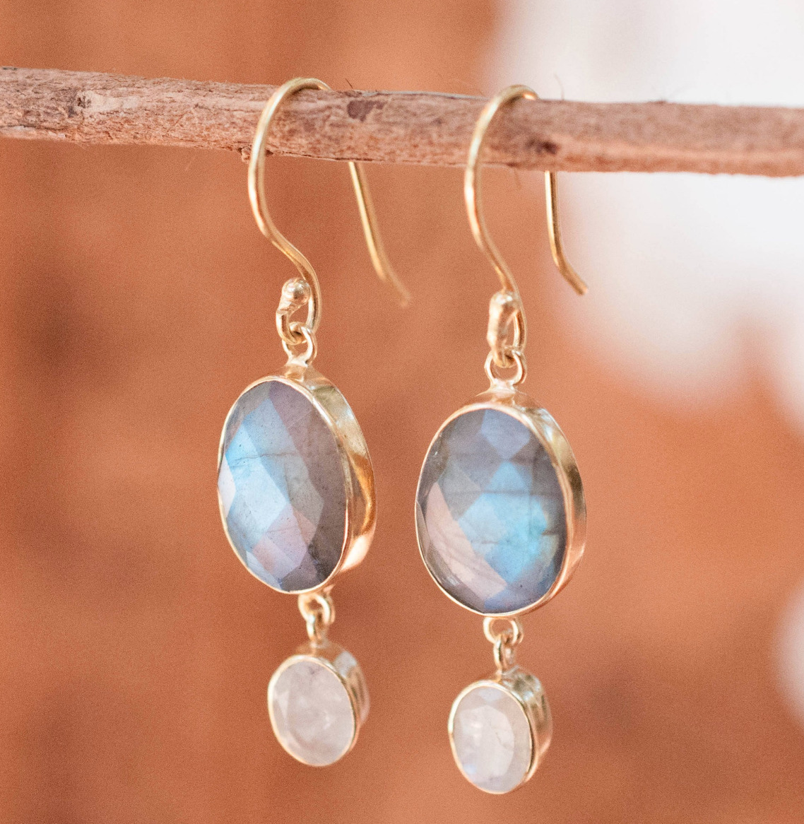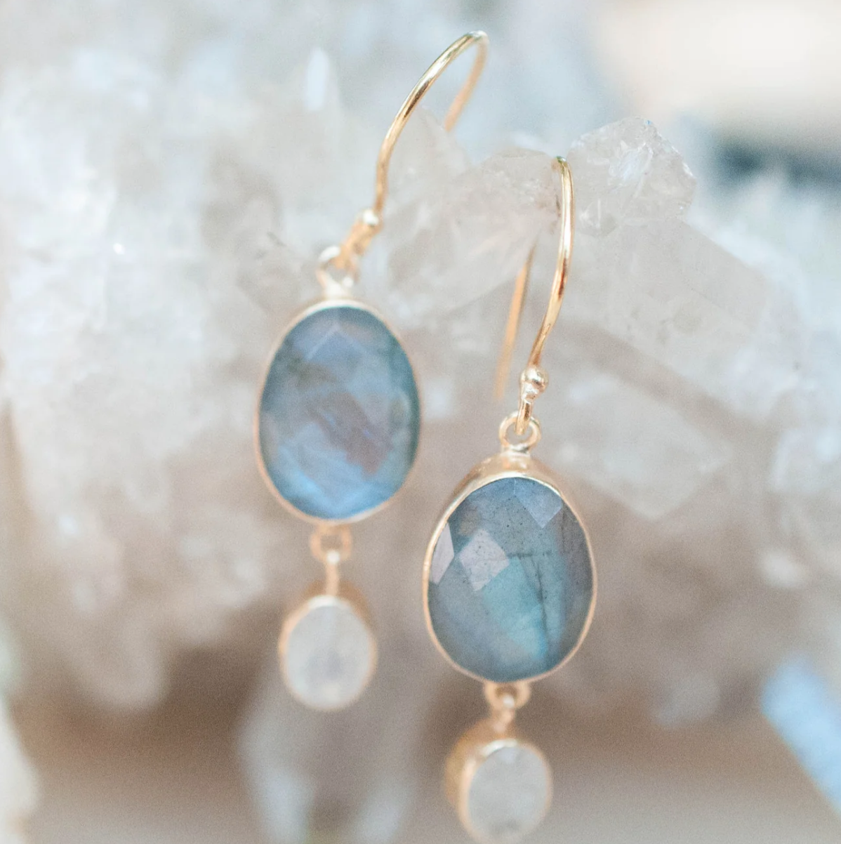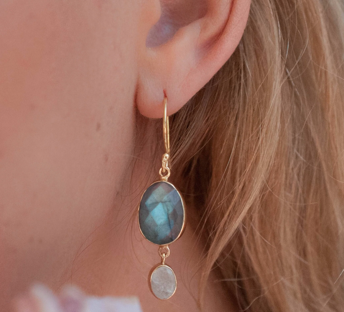 Delikate øredobber med labradoritt og månesten som symboliserer ny begynnelse, indre visdom og magien som oppstår når du følger intuisjonen din.
