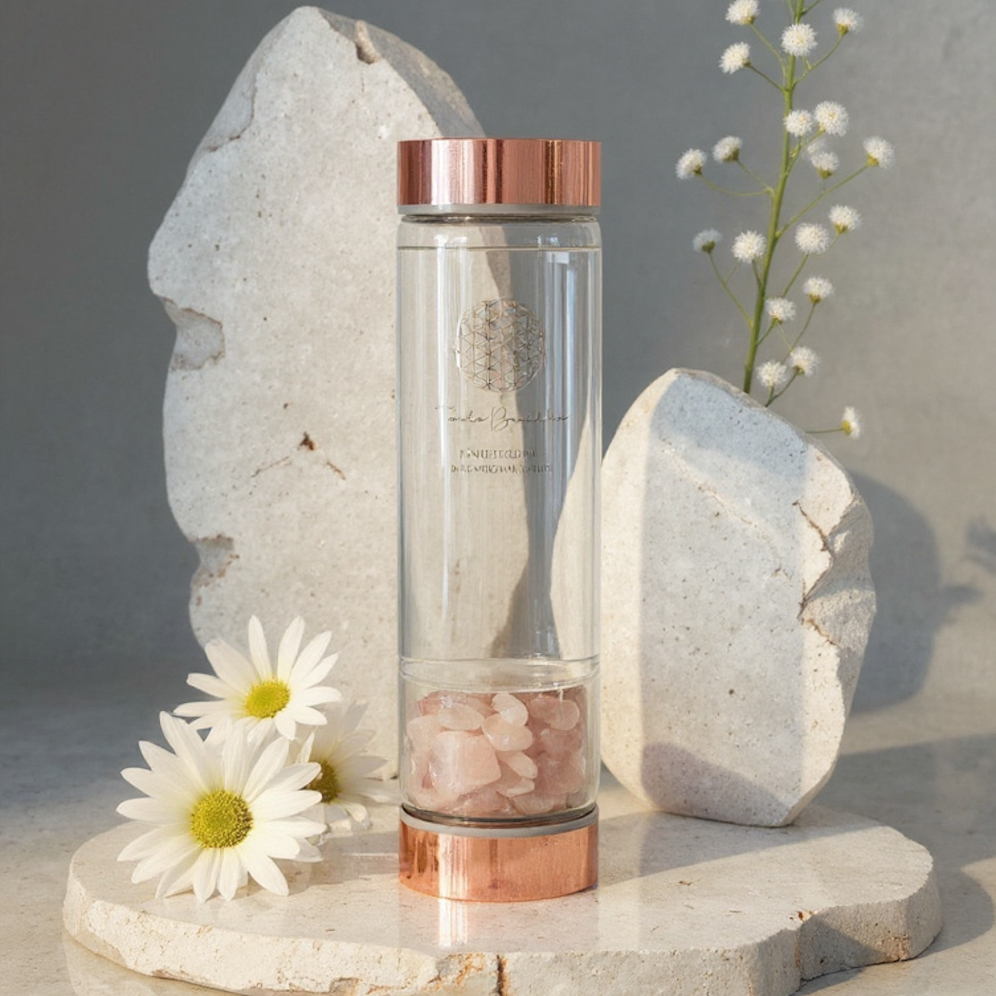 Rosenkvarts er kjærlighetens stein og åpner hjertet for dyp indre ro, harmoni og ubetinget kjærlighet. Denne flasken minner deg om å praktisere egenkjærlighet og tiltrekke deg positive relasjoner. Perfekt for deg som ønsker mer kjærlighet i hverdagen.