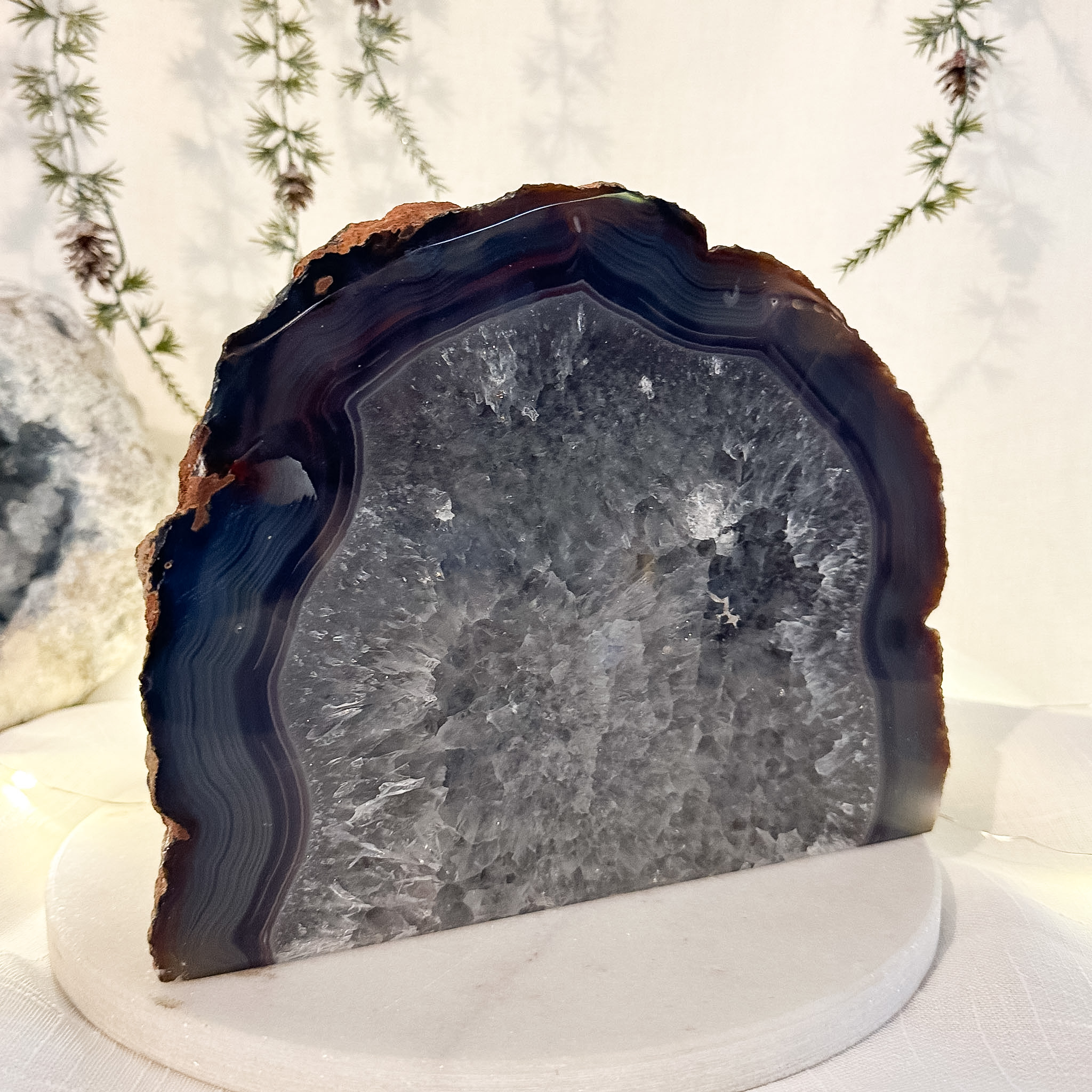 Agat er kjent som en jordende og harmoniserende krystall. Den hjelper deg å lande i kroppen, roe nervesystemet og skape balanse mellom følelser og tanker. Når du holder eller plasserer en agat-skive i rommet, inviterer du inn en stillferdig, men dyp energi – som om Gaia selv hvisker: Du er trygg. Du hører til.