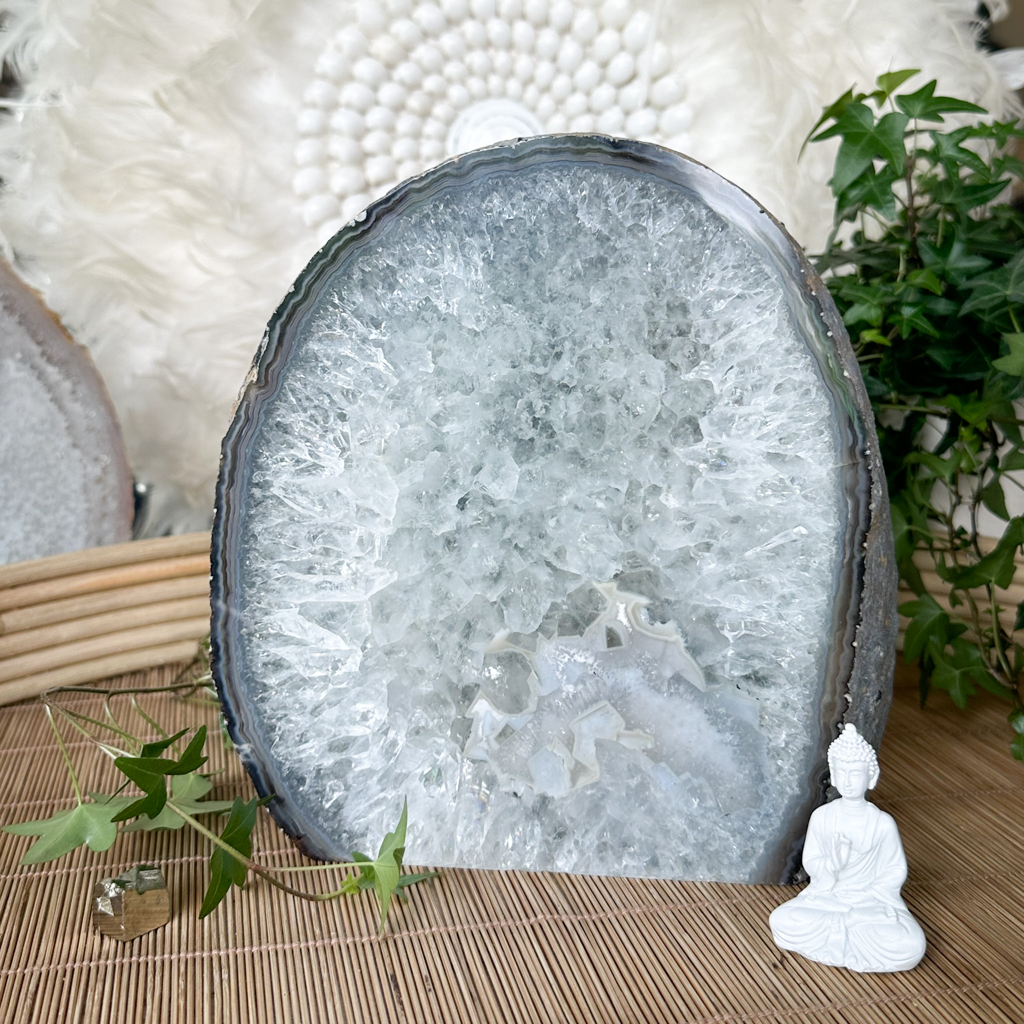 Dette vakre agatinteriøret bringer naturens kunstverk inn i hjemmet ditt. Hver sten er unik, med bølgende mønstre og dype farger som minner om havets lag og Lemurias’ skjulte skatter
